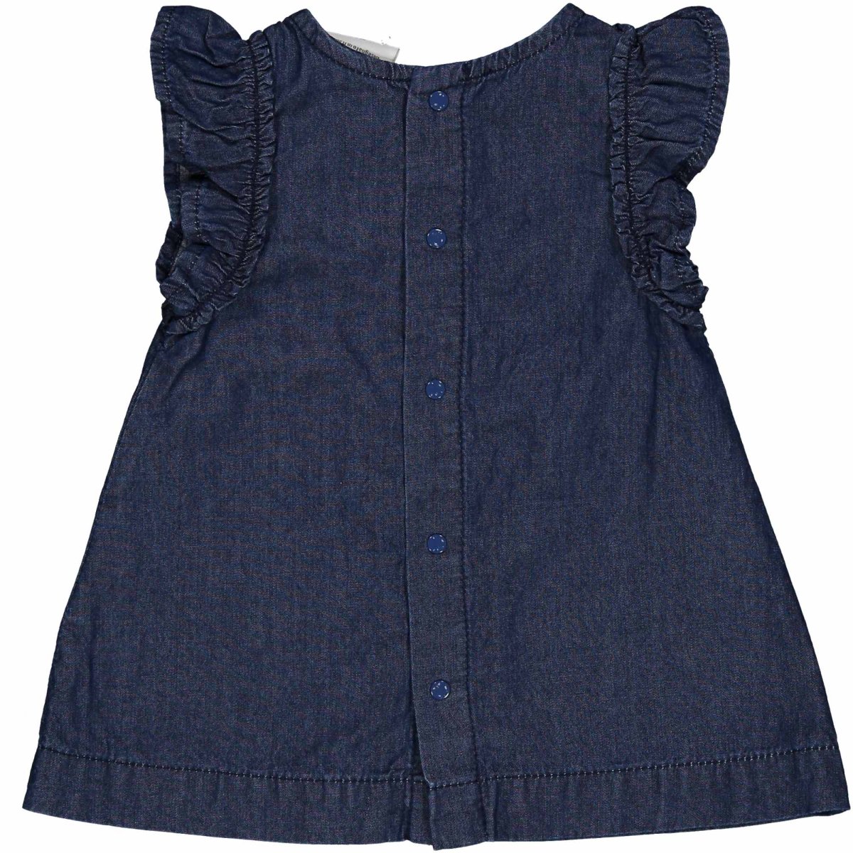 Vestito 100% cotone, effetto denim, con ciliegie ricamate, a giro manica con manica a rouche