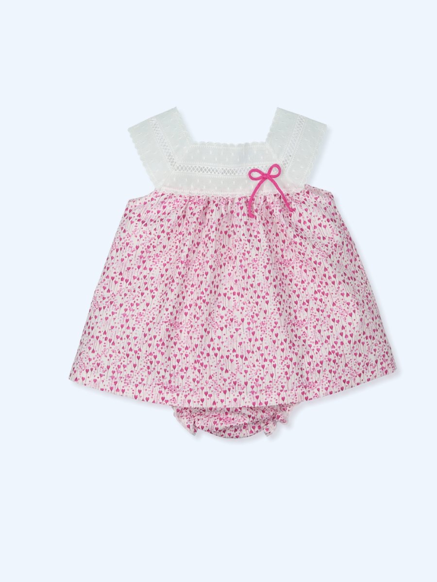 Vestito a fantasia cuoricini fuxia con corpetto bianco ricamato e applicazione fiocchetto in filo con culotte coordinata
