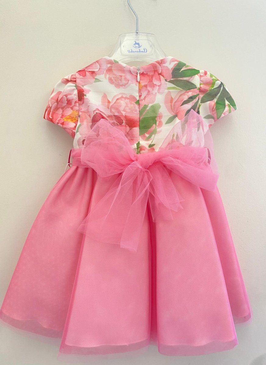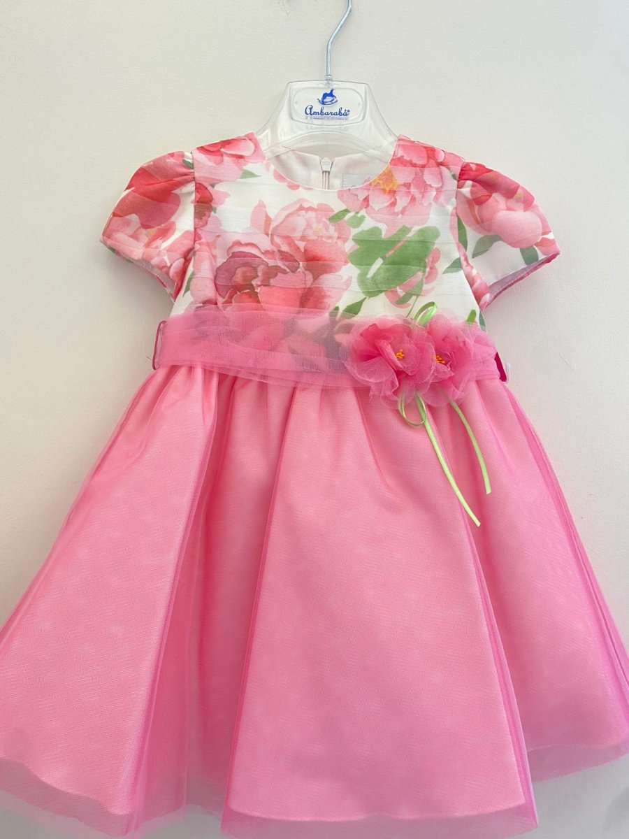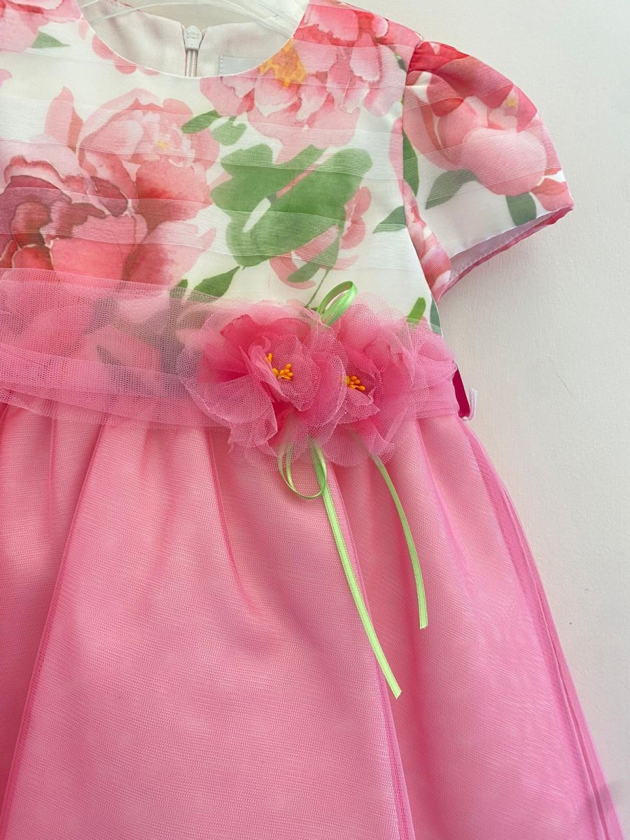 Vestito con corpetto fantasia fiori e gonna in tulle fuxia, spilla removibile fiorellini in vita
