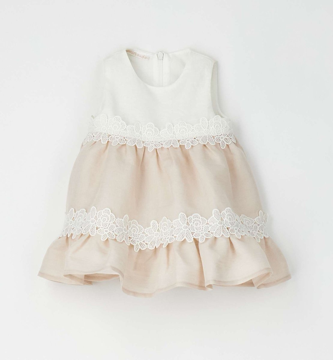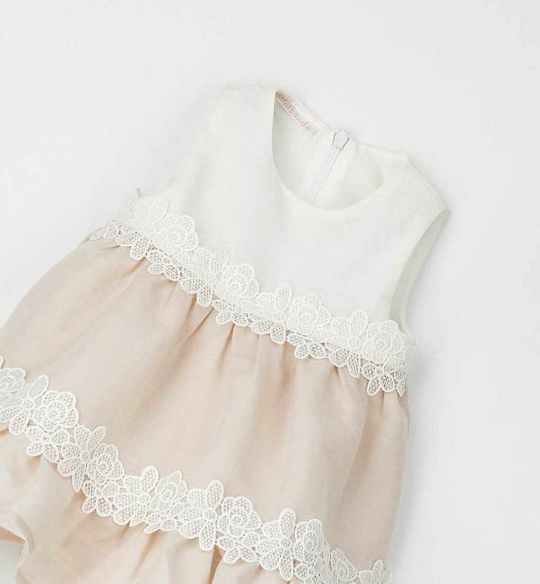 Vestito a giro manica con corpetto in lino colore panna e gonna colore rosa antico con fascia di fiorellini in pizzo. Chiusura posteriore con cerniera.