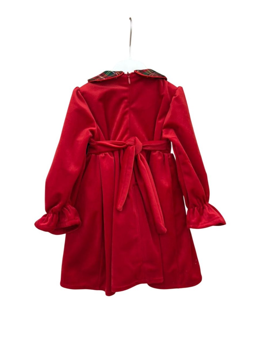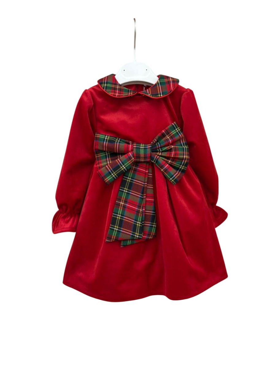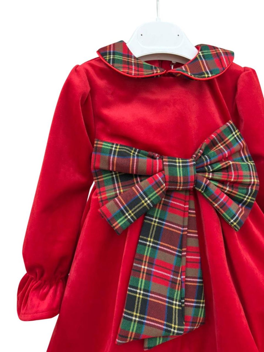 vestito pappa & latte con manica lunga e rouge nella parte sottostante , colore rosso in velluto con fiocco nella parte anteriore in tartan, colletto tondo in tartan.