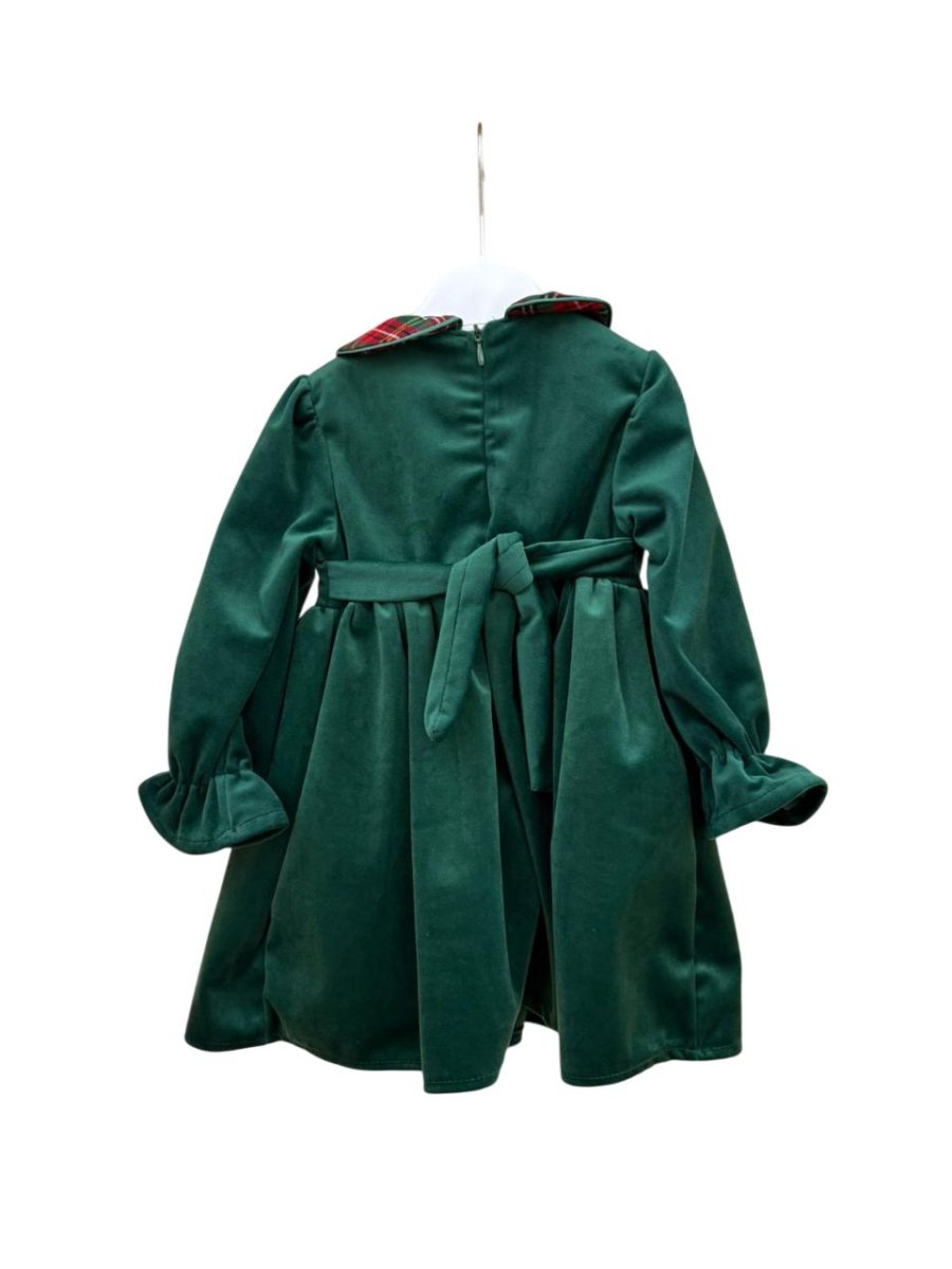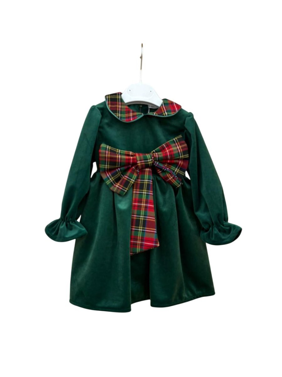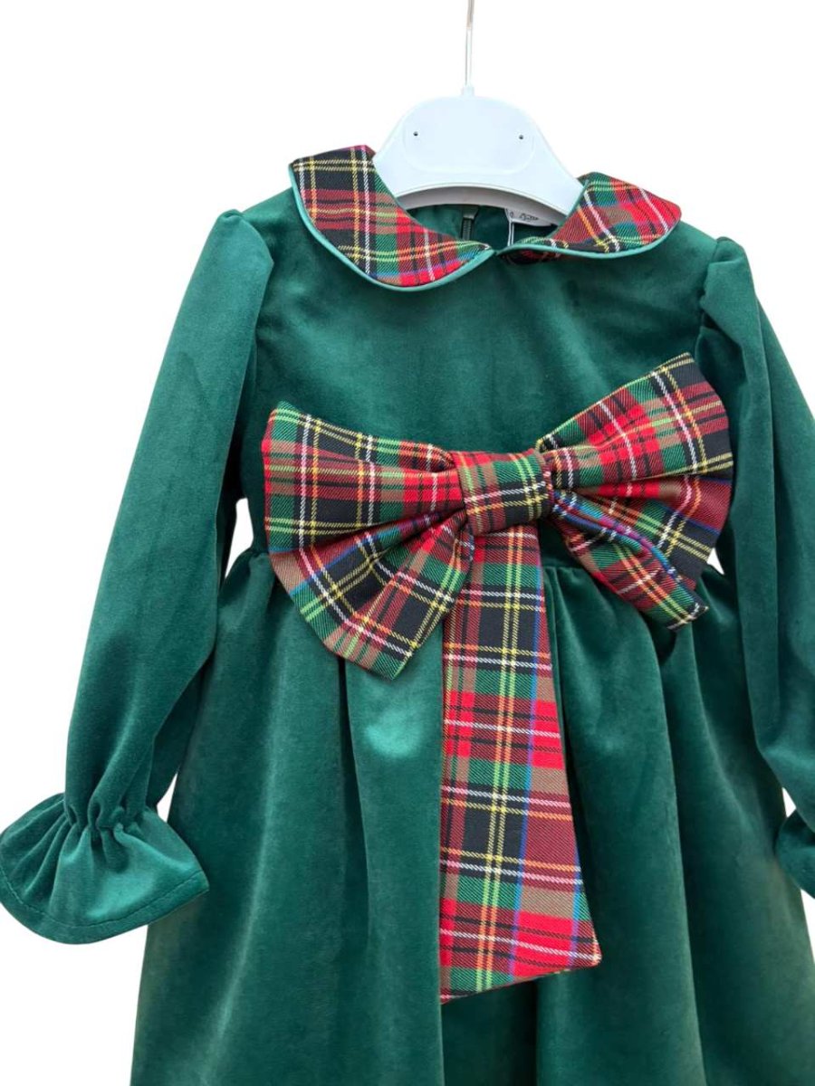 vestito pappa & latte con manica lunga e rouge nella parte sottostante , colore verdone in velluto con fiocco nella parte anteriore in tartan, colletto tondo in tartan.