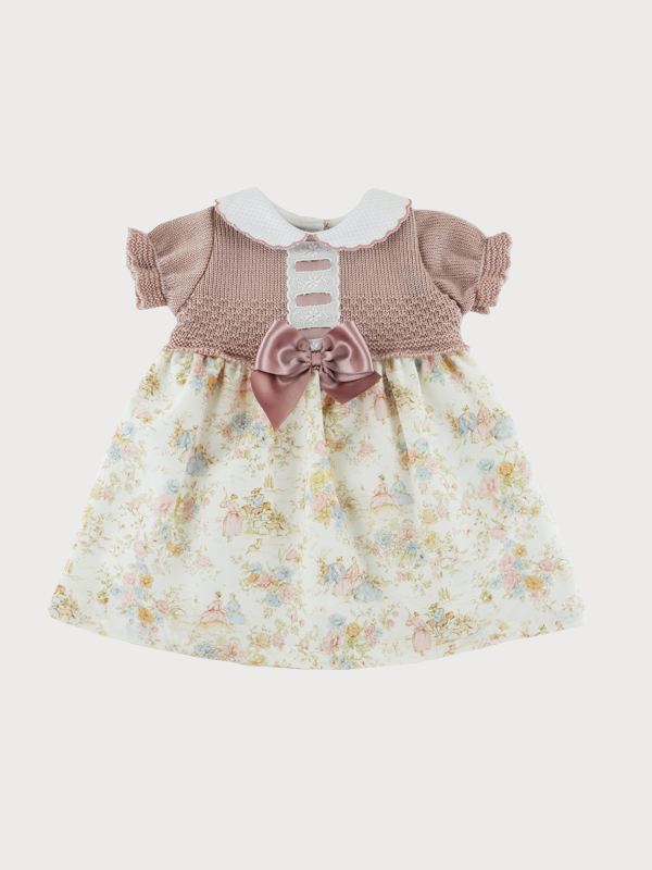 Vestito con corpetto in maglia rosa antico e gonna fondo bianco a fantasia fiori con applicazione fiocco in raso