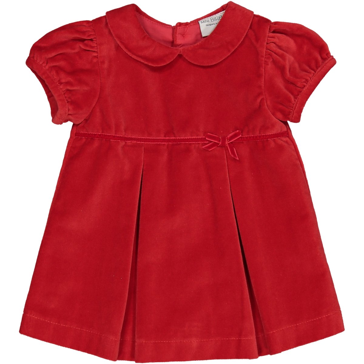 Vestito colore rosso Birba, in velluto con applicazione fiocchetto e chiusura bottoncini nella parte posteriore.