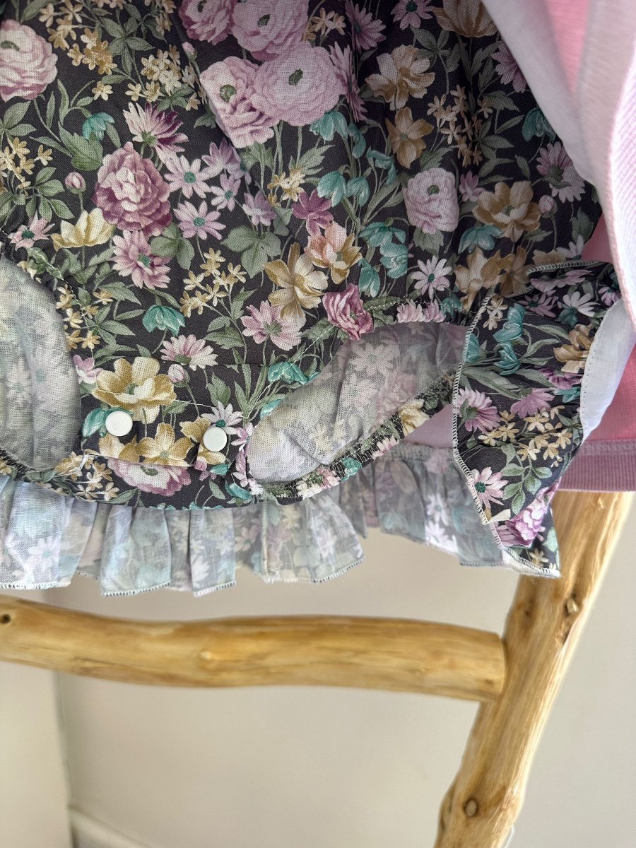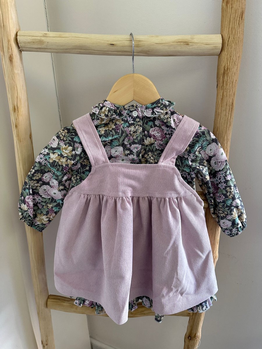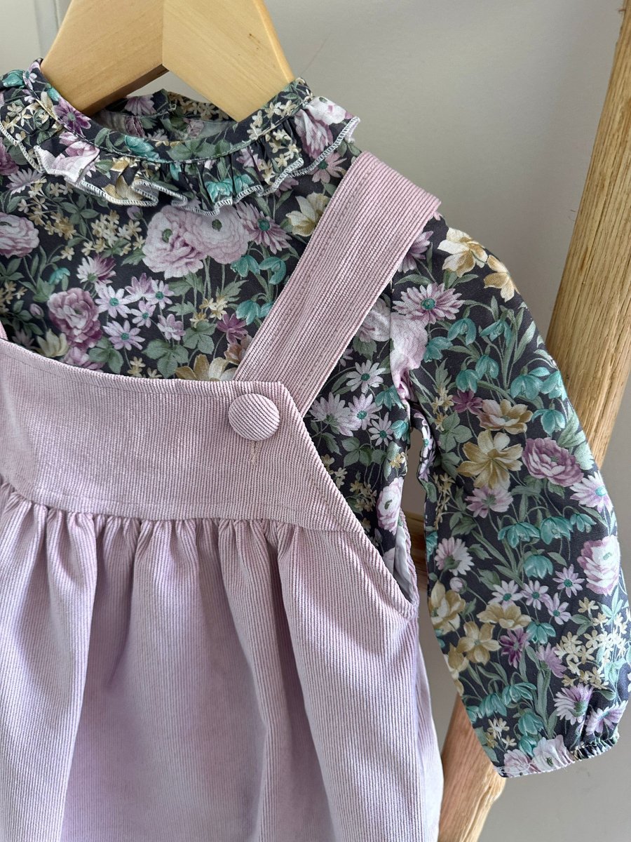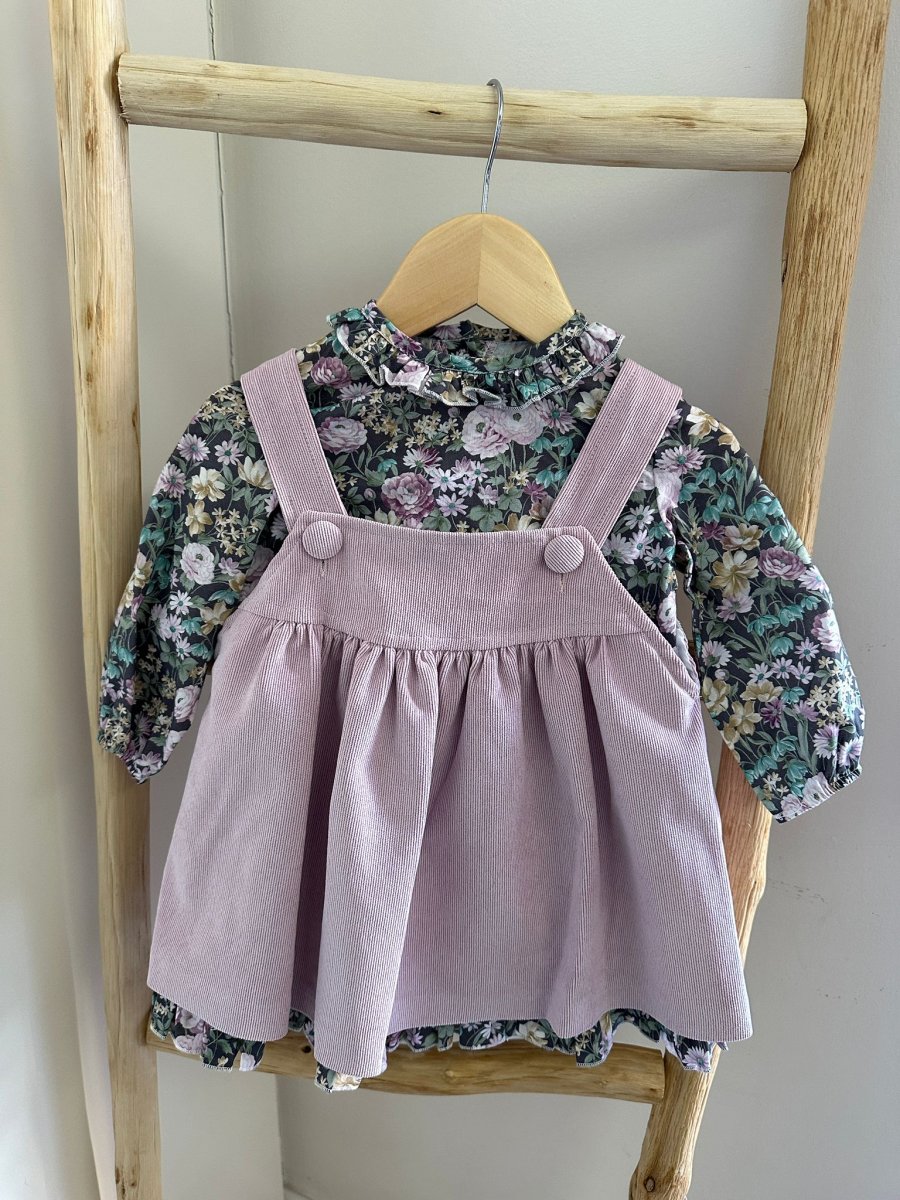 Vestito a salopette rosa in velluto con camicina body a fantasia fiorellini