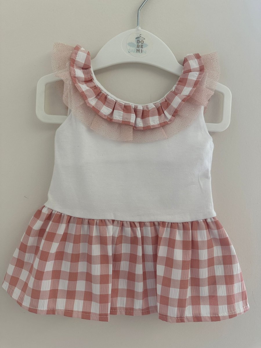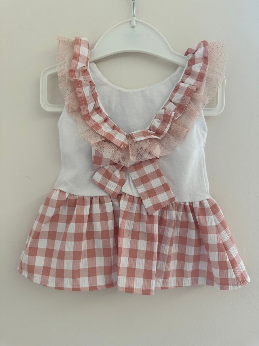 Vestito in cotone bianco con gonna a quadri rosa, rouge al colletto a quadri, scollo a V nella parte posteriore con fiocco