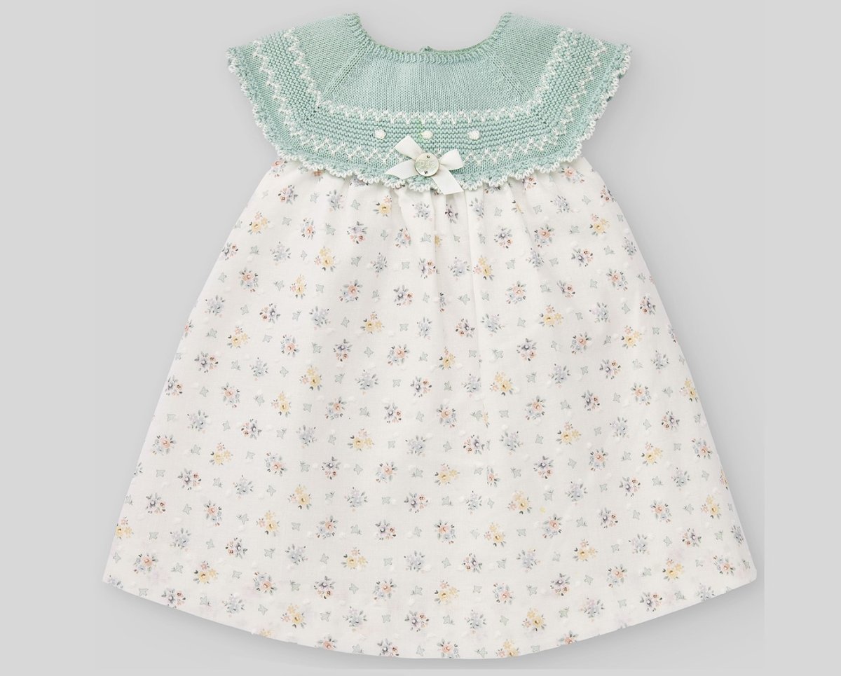 Vestito con corpetto verde acqua e gonna bianca in plumetis con stampa fiorellini