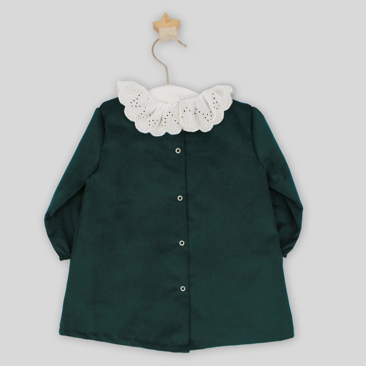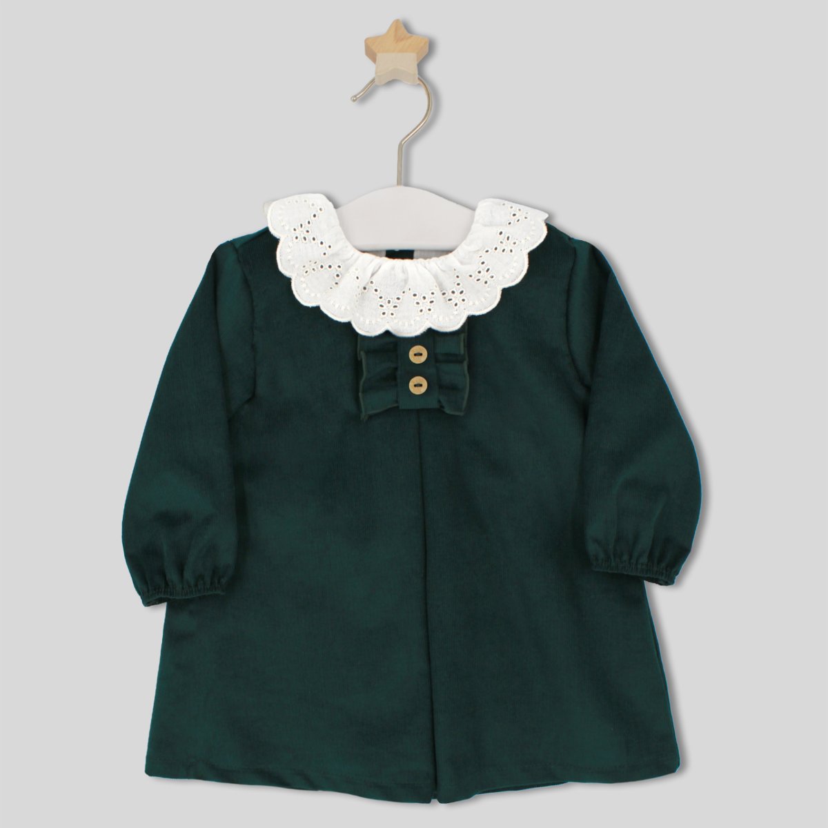 Vestito Rapife colore verde in velluto con colletto bianco in pizzo sangallo.